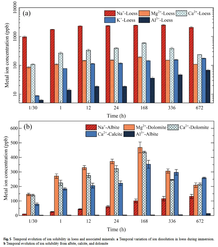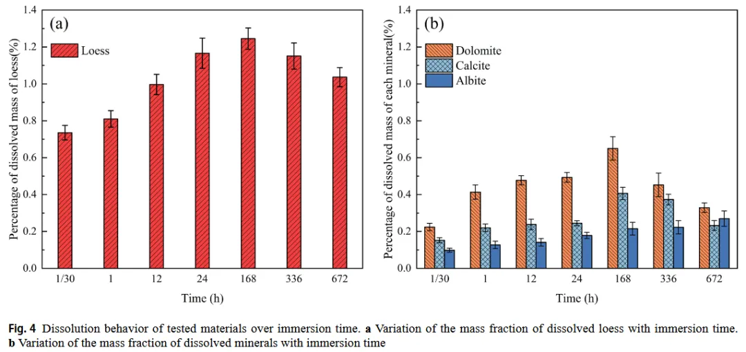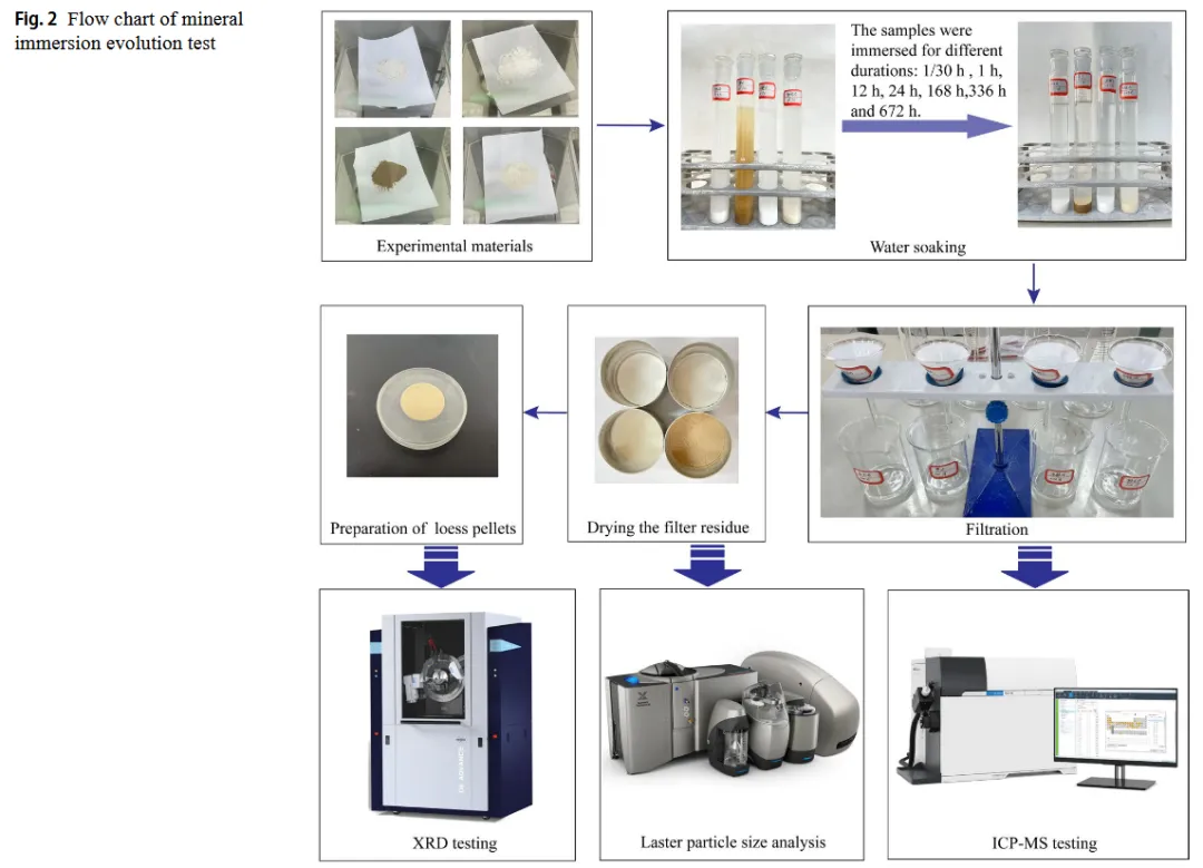 - 设计:黄土及纯矿物(钠长石/方解石/白云石)浸水实验,设置7个时间节点(1/30 h至672 h)。