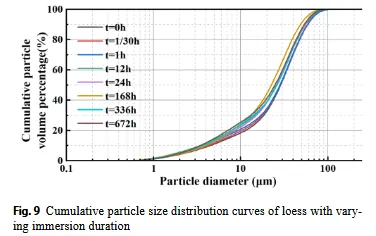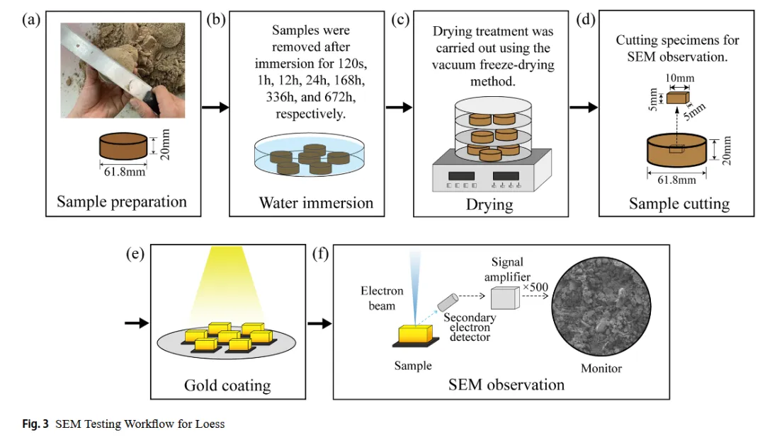 本研究考察了不同浸泡条件下,矿物成分转化对兰州黄土湿陷机理的影响。兰州黄土以及钠长石、方解石和白云石被用作实验材料。在不同的浸泡时间后进行X射线衍射(XRD)、电感耦合等离子体(ICP)光谱和激光衍射粒度分析,以评估矿物组成、离子浓度和粒度分布。扫描电子显微镜用于检查颗粒接触和孔结构。在浸泡的前0-24小时内,可溶性盐和碳酸盐的溶解破坏了胶结接触,导致孔隙快速塌陷和结构破坏。在24~336 h之间,钠长石经历了水化和破裂,进一步削弱了黄土骨架,导致持续沉降。从336到672 h,石英、蒙脱石和高岭石等次生矿物——由长石水化产生——开始填充孔隙,减小孔径,增加孔隙数量,并逐渐稳定微观结构。在这个阶段,崩溃过程已经接近完成。这些发现为兰州地区的工程实践提供了理论依据,增强了对湿陷性黄土在水渗透下行为的认识。研究目标与背景