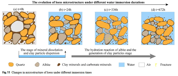“兰州黄土湿陷本质上是水-岩相互作用驱动的矿物相变与结构重组过程:盐溶启动崩溃 → 长石水化延续破坏 → 次生矿物促稳” (附注:全文通过多尺度实验首次阐明钠长石水化对湿陷的长期贡献,为黄土区工程地质风险评估提供新理论框架。)