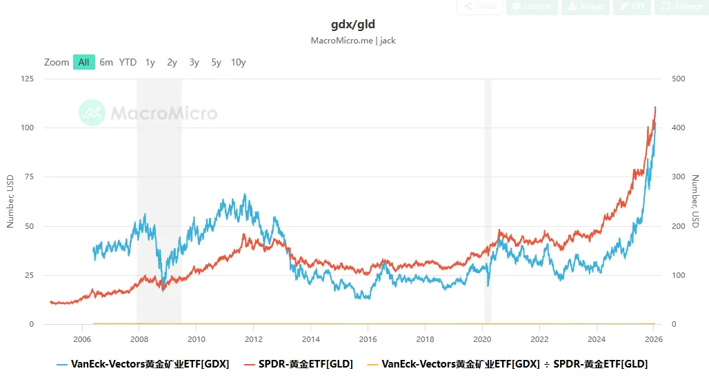 典型案例 (2016年上半年): 金价从 $1,050 反弹到 $1,370 (+30%),GDX 从 12 涨到 31 (+150%)。这是一次典型的估值修复。