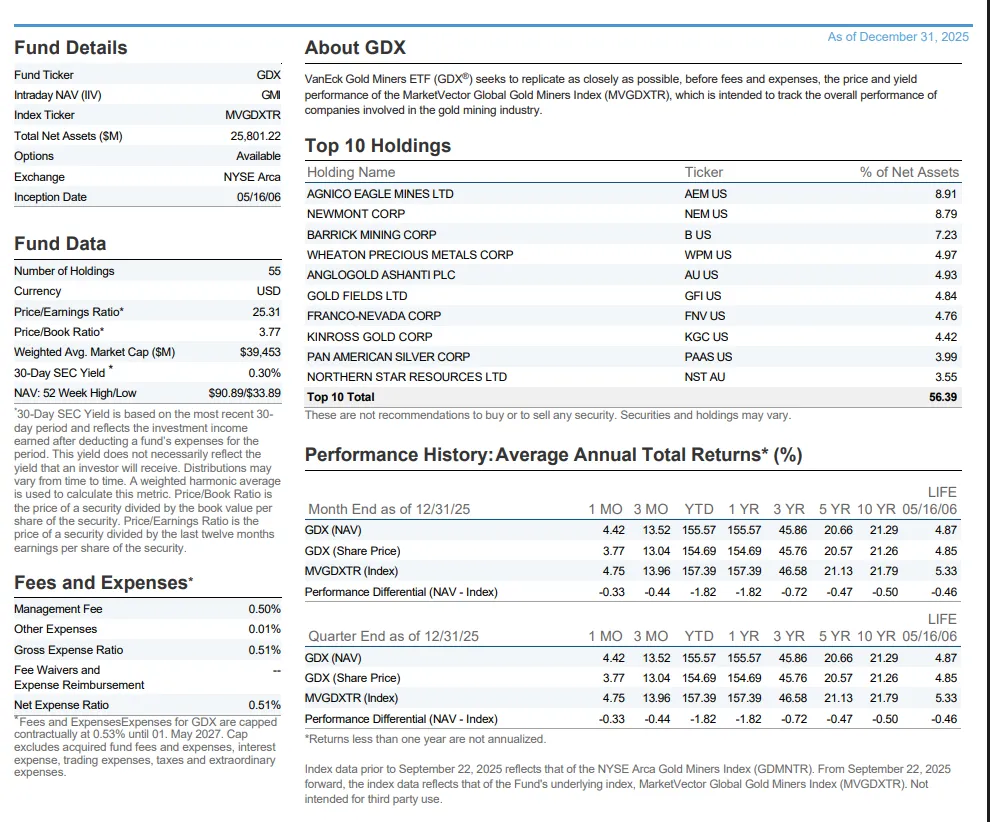 GDX:大型金矿ETF。静态PE大约20-25x,动态大约15-20x。估值相对合理,稳健的选择。激进的有杠杆ETF。