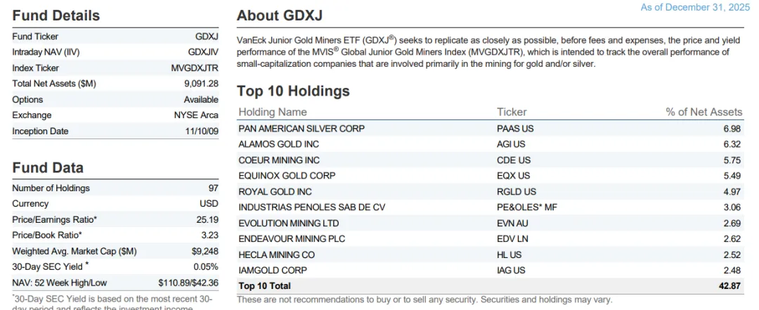 GDXJ:小型金矿ETF。市值100多亿美金的小型公司,PE比GDX略低一些,但是去年10月份以来涨幅高于GDX,说明修复已经到小盘股。