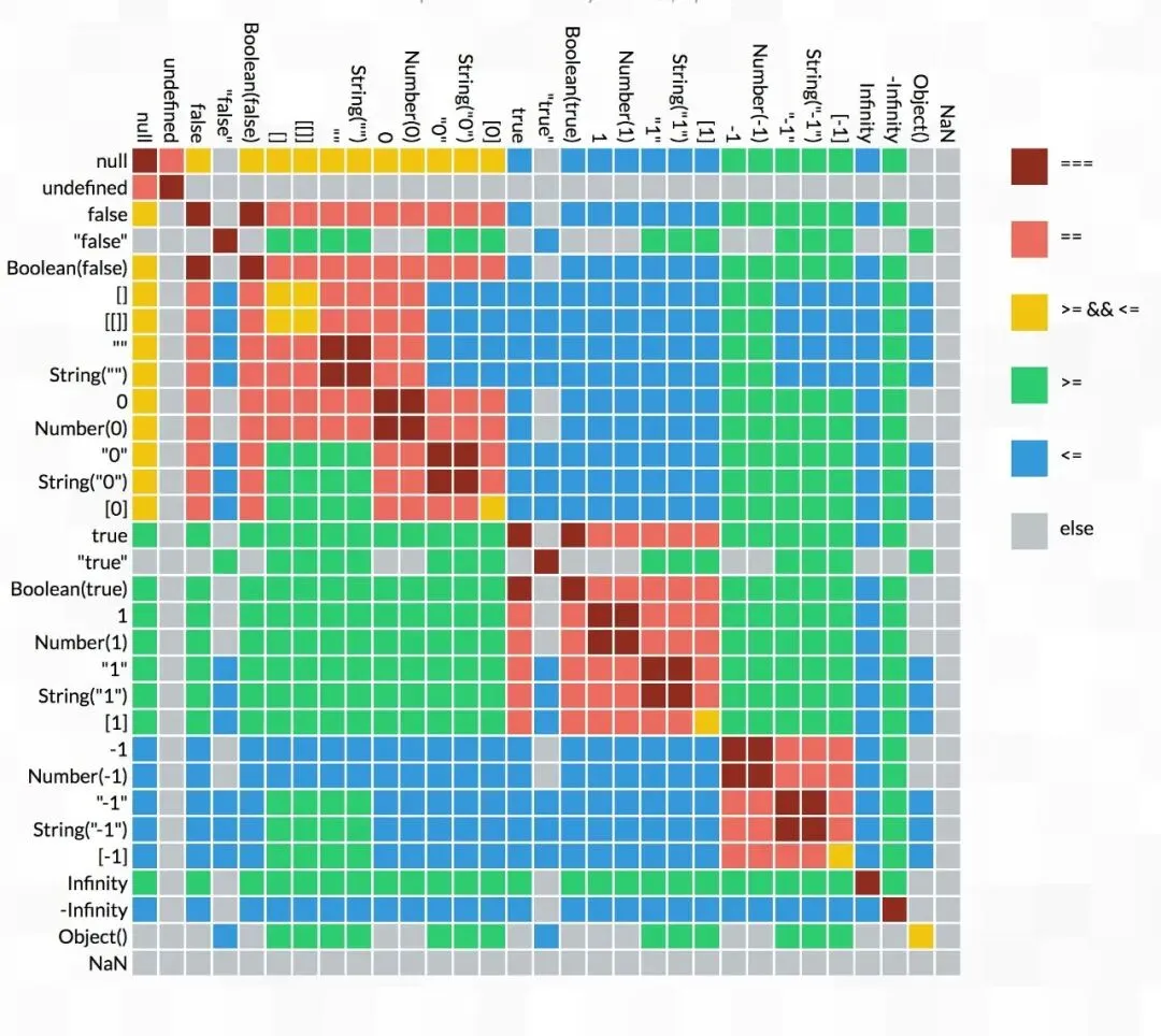 undefined 与 null 互相相等,与其他值为falseNumber与String/Boolean比较时,后者将会被转化ToNumber;与对象进行比较时,后者将会被转化ToPrimitiveString与Number/Boolean比较时,均转换ToNumber;与对象比较时,后者将被转换ToPrimitiveBoolean与Number/String比较时,与上例相同Object与Number/String/Boolean比较时,前者将被转换ToPrimitive,Boolean被转换ToNumber