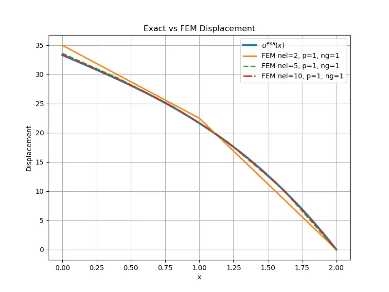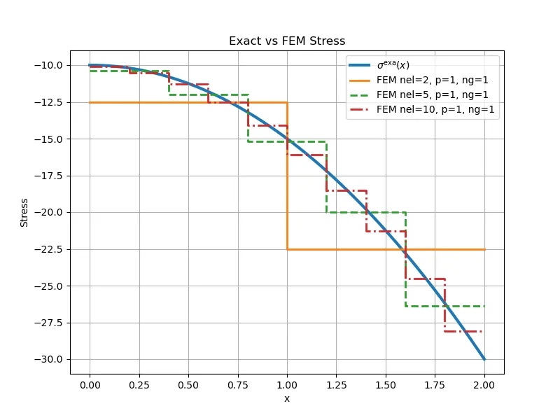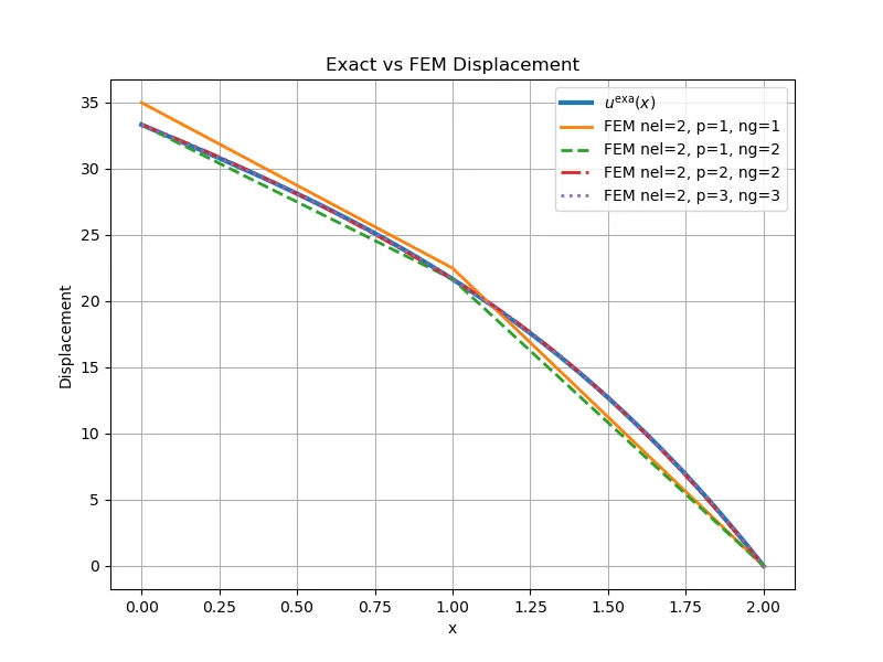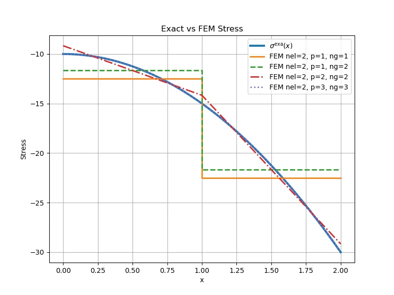 return x_plot, u_h, sigma_h然后可以自定义nel, p, n_gauss这三个参数。我们先固定单元数,比较不同的p 和 n_gauss: