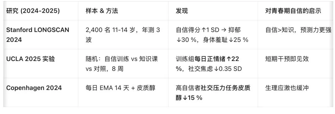 2024-2025 三项纵向研究显示:对青春期变化感到“自信/准备好”的青少年,抑郁症状↓30 %、身体羞耻↓25 %、学业参与度↑0.4 SD。