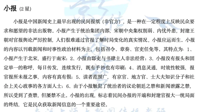 逐梦岛考点笔记小众册直接押中!“小报”和“邸报”的考点出现在《中国新闻传播史》的第一章“中国古代的新闻传播活动”。这个考点是上师大传播学相当喜欢考的,重复考了不下三次了,本次要谈论区别,有些同学就蒙了,学长早就跟大家强调过,在答题当中,“区别”就等于“特点”,所以你只要简单展开写下“小报”的特点,实际就是“小报”和“邸报”的区别,这道题就完成啦!