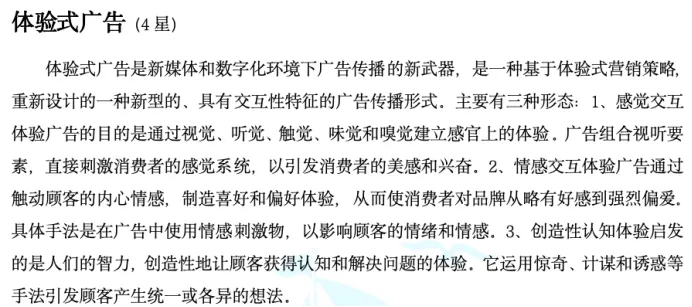 逐梦岛的广告专题笔记中,对“体验式广告”的形态、特征、意义、问题和发展策略进行了全面的补充,直接默写即可,应对课外的广告考点,从本次考研试题来看,逐梦岛式全部覆盖了。