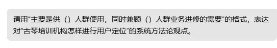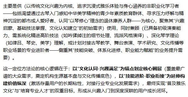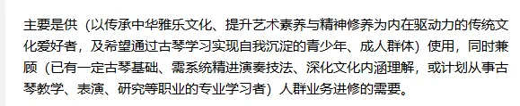 主要是供(以传承中华雅乐文化、提升艺术素养与精神修养为内在驱动力的传统文化爱好者,及希望通过古琴学习实现自我沉淀的青少年、成人群体)使用,同时兼顾(已有一定古琴基础、需系统精进演奏技法、深化文化内涵理解,或计划从事古琴教学、表演、研究等职业的专业学习者)人群业务进修的需要。