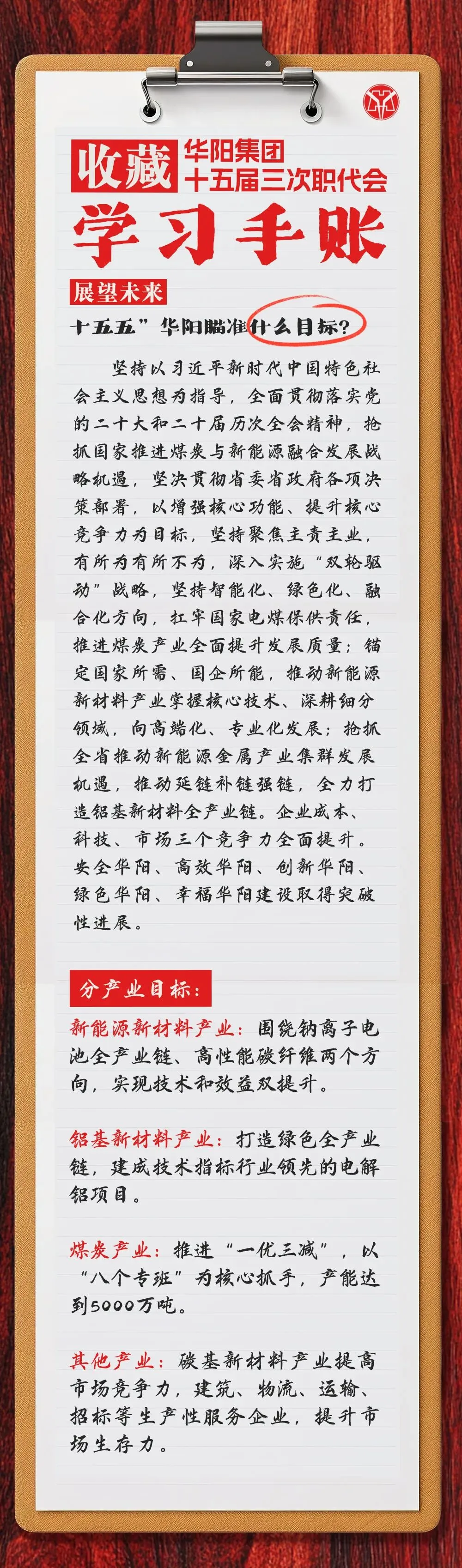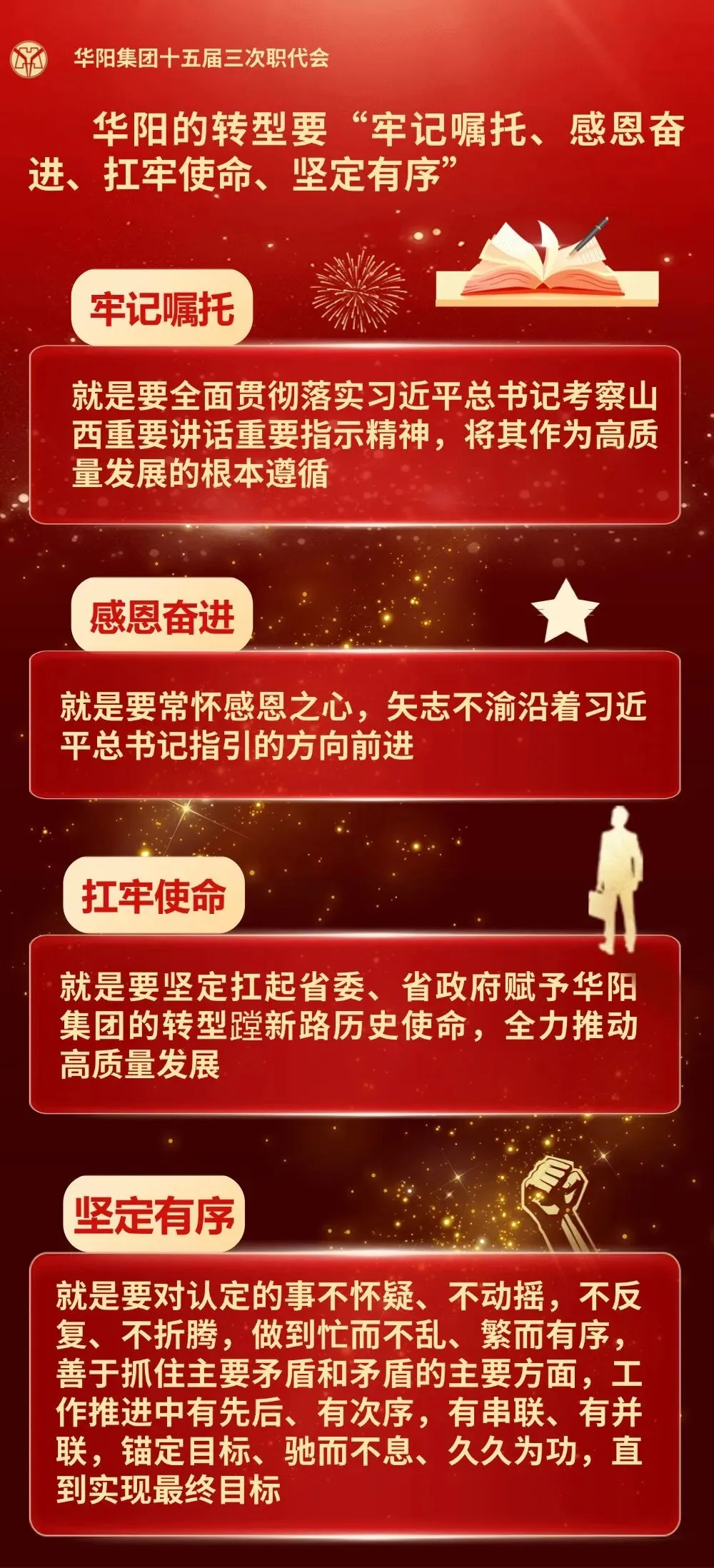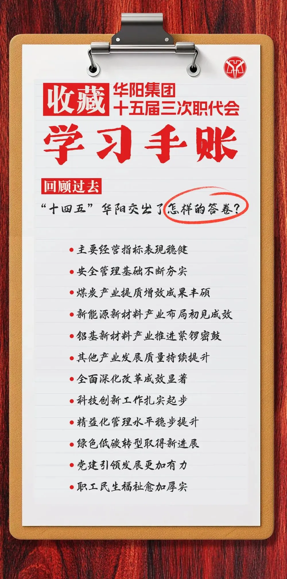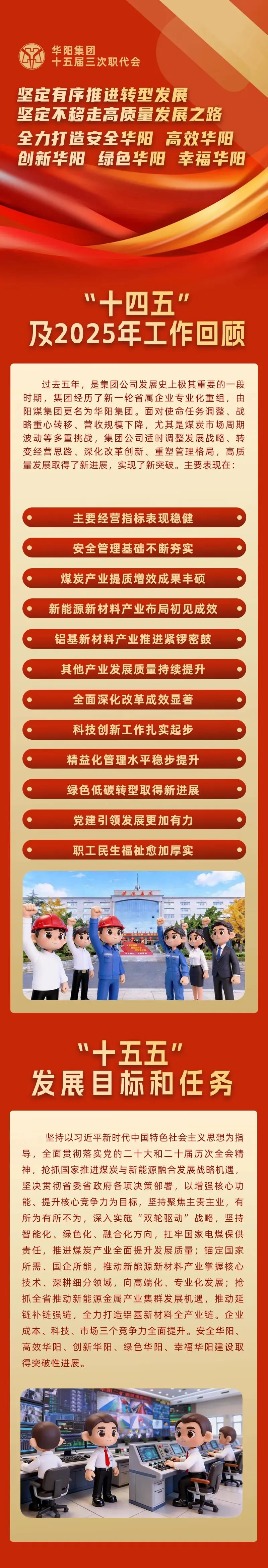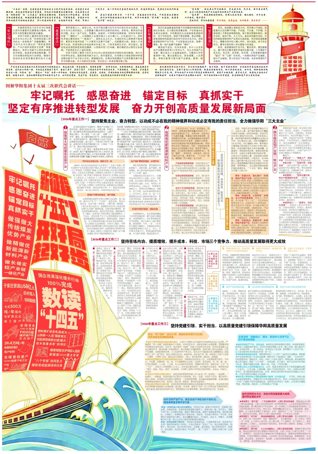 1月16日,华阳集团十五届三次职代会召开,为华阳集团坚定有序推进转型发展,全力打造“五型华阳”,奋力开创高质量发展新局面,擘画了蓝图,指明了路径。连日来,集团官微发布了一系列职代会学习资料,今天,小编进行了集中整理,方便大家更好地学习领会职代会精神。
