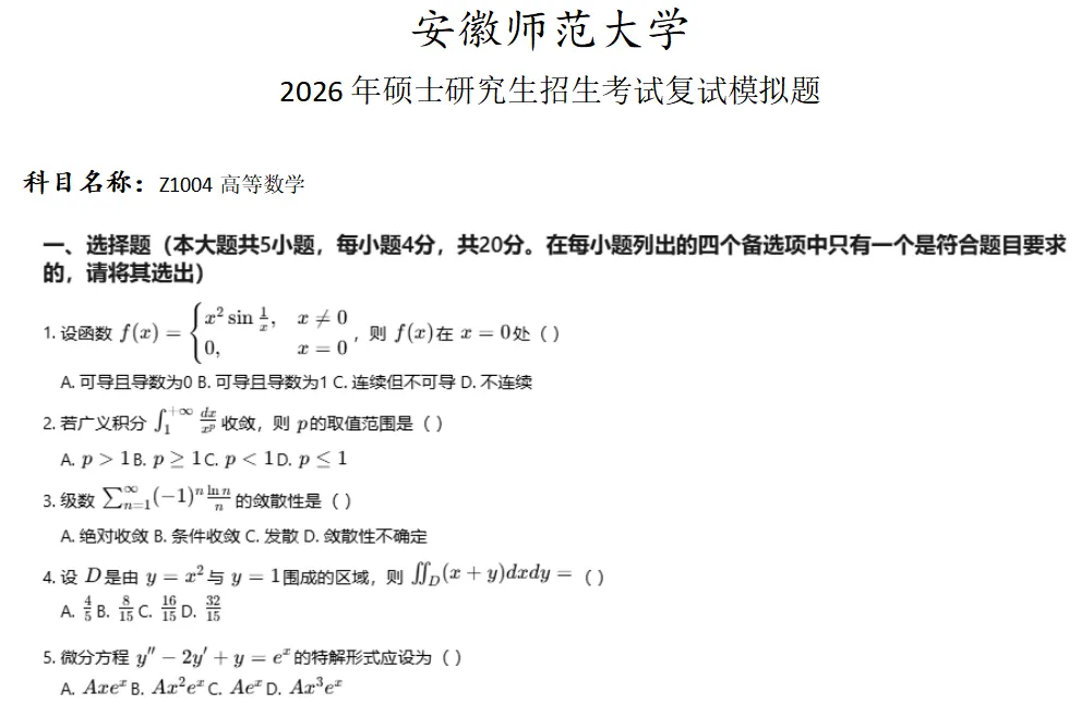 安徽师范大学Z1004高等数学考研复试真题模拟