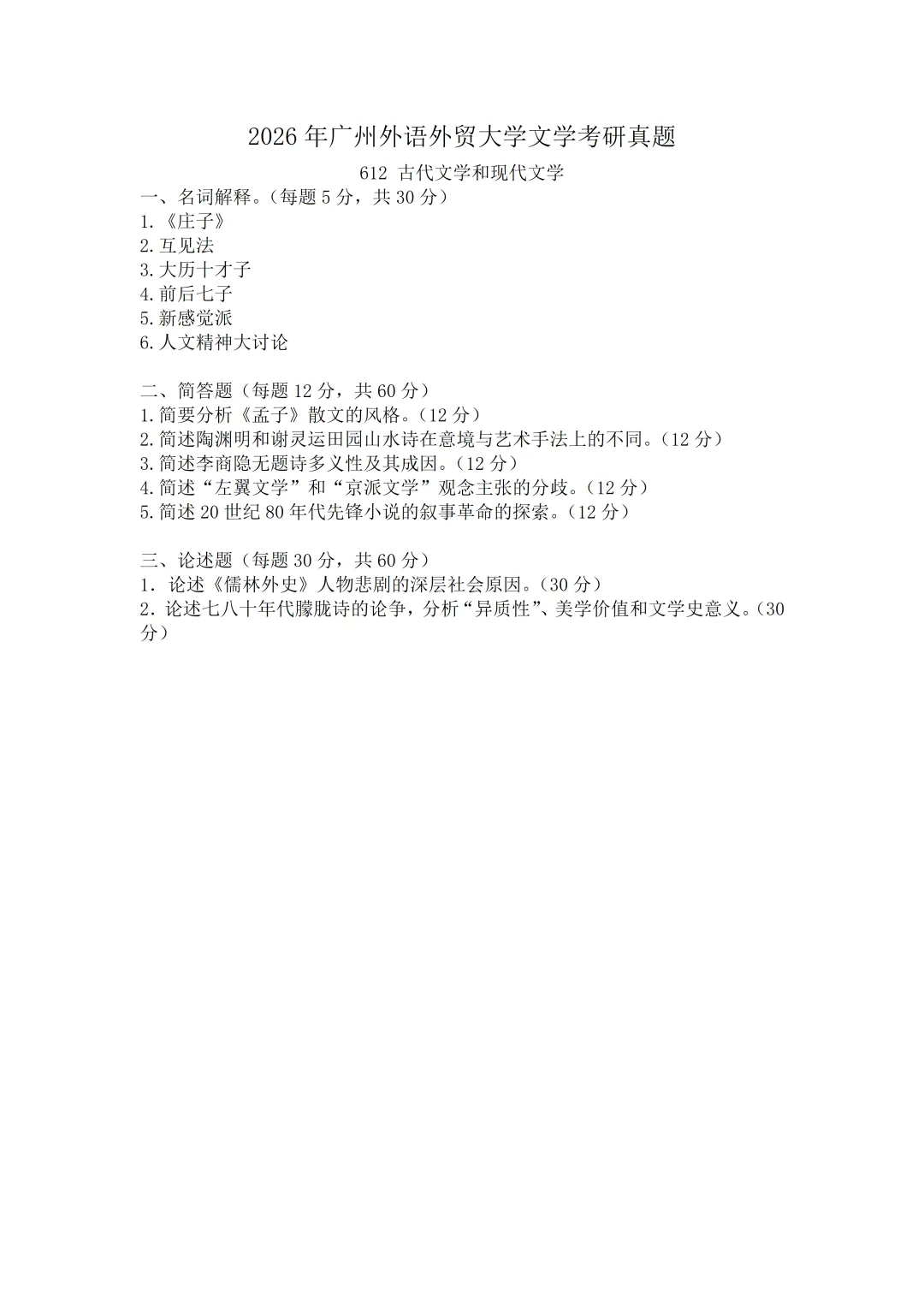 >【真题速递】2026年广州外语外贸大学文学考研真题