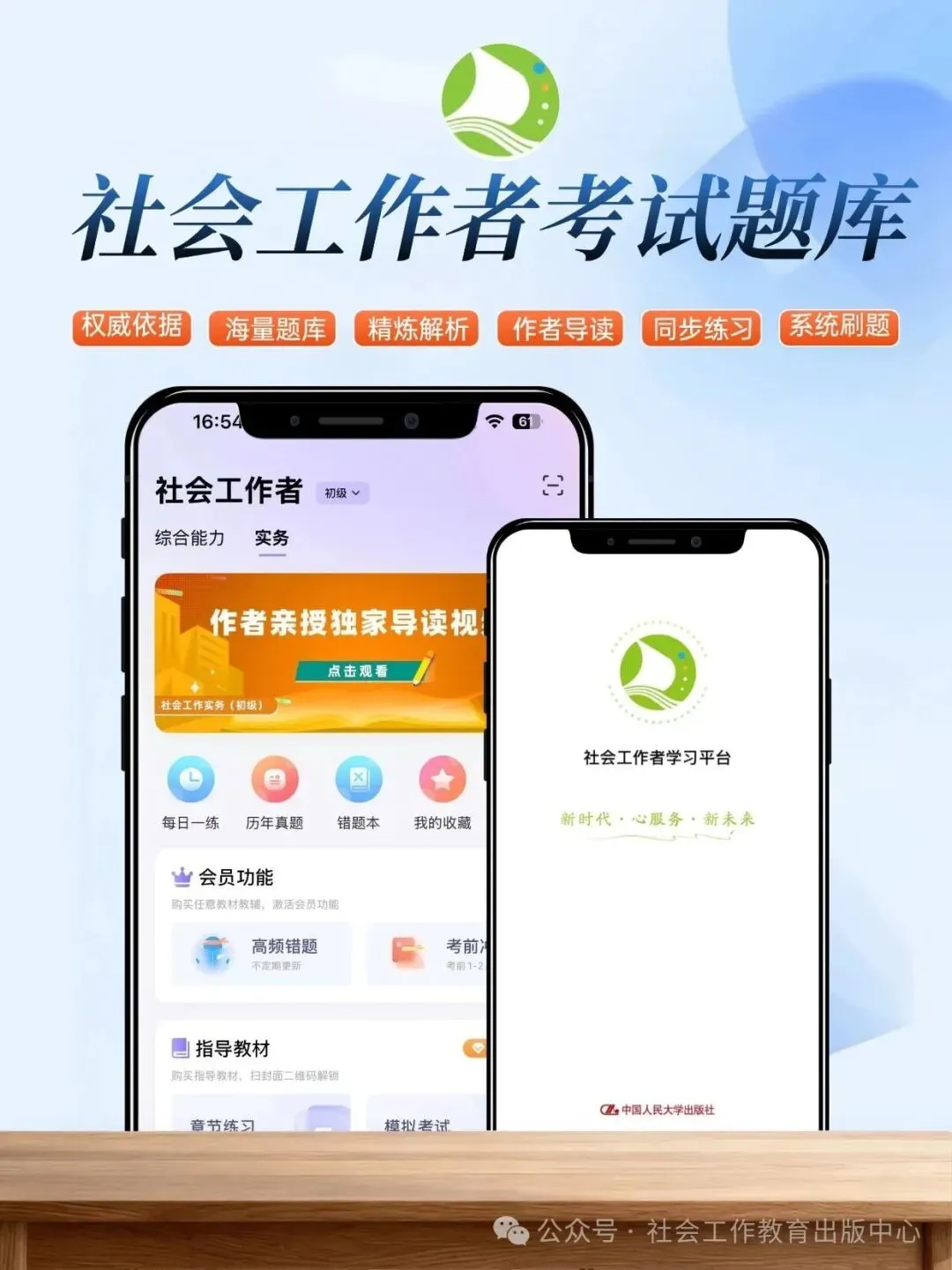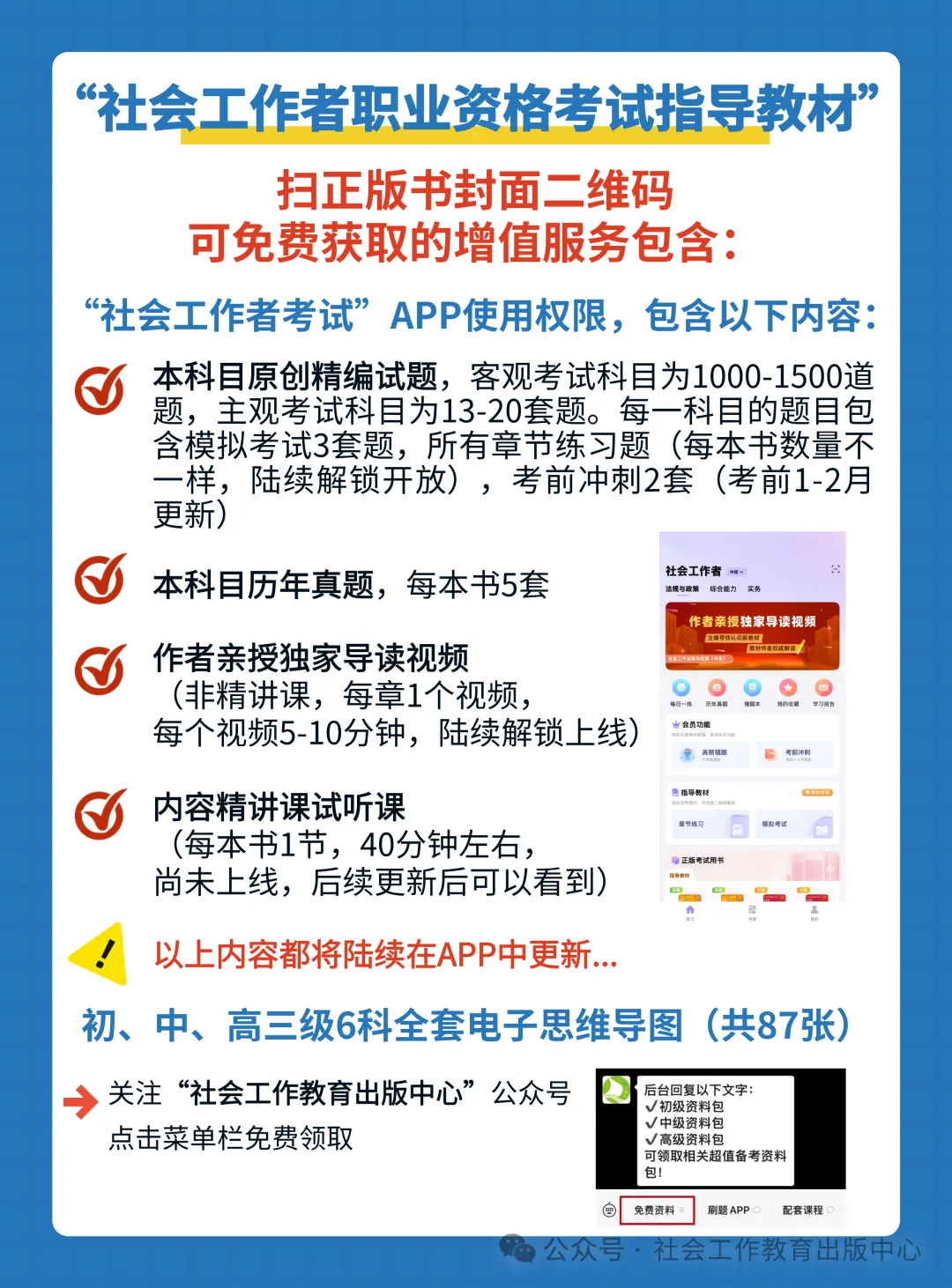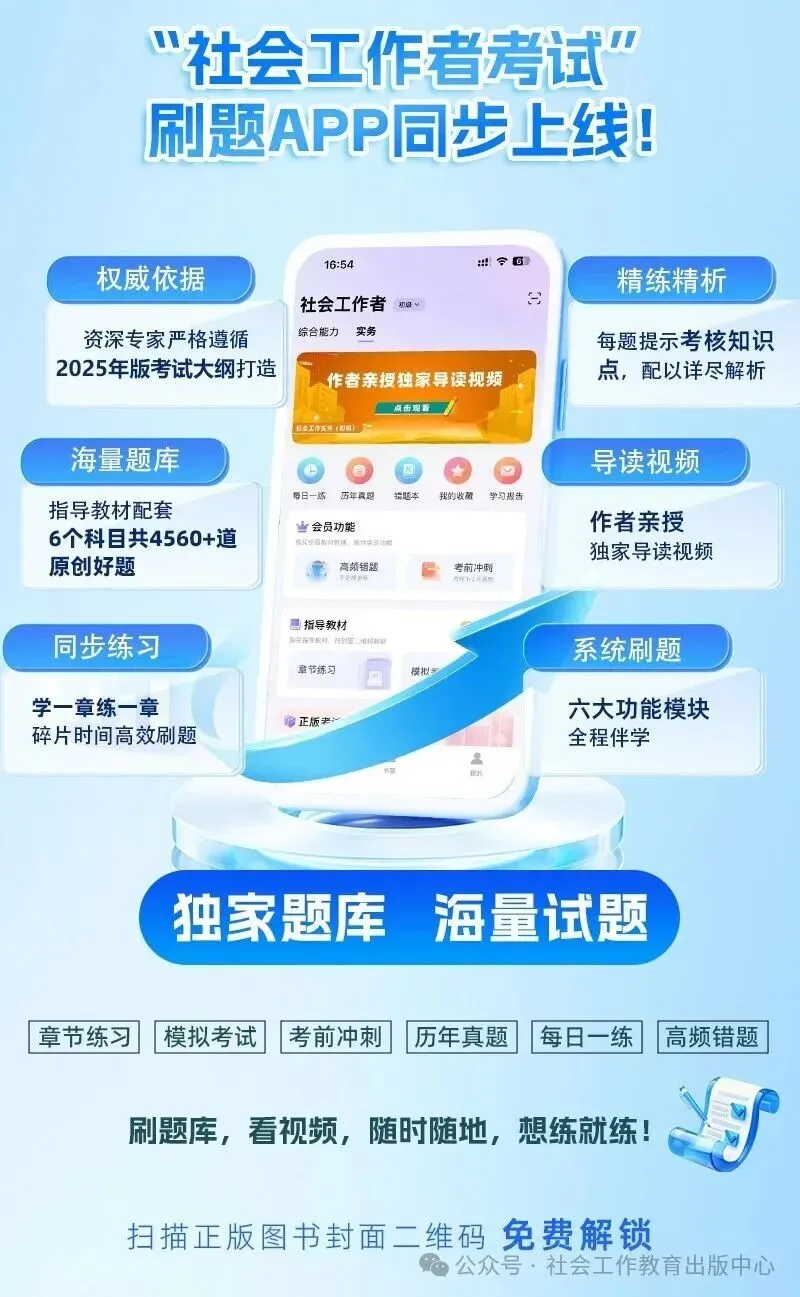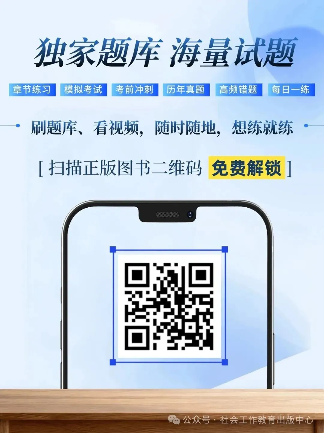 购买人大出版社正版“社会工作者职业资格考试指导教材(2026)”,扫描正版图书封面二维码,即可免费激活由中国人民大学出版社联合教材作者与资深专家团队重磅打造的“社会工作者考试”APP,获得你的专属移动备考系统,海量试题、作者视频,随时随地复习~