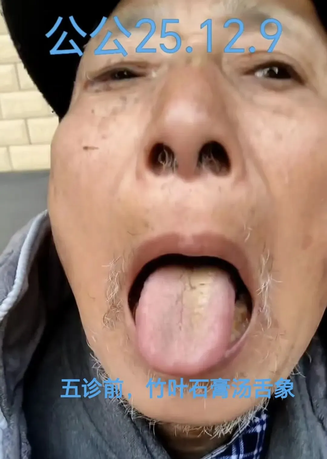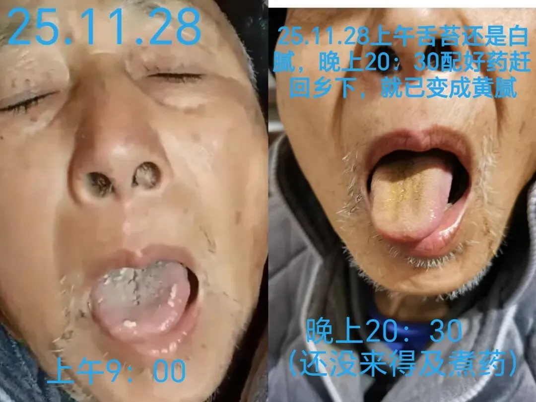 2025.11.28日上午,婆婆才打电话告知公公感冒加重,除了喝水已2天没吃东西,不停呕吐、尿失禁,婆婆不会把脉,舌照也是视频截图(老人不会操作手机,截图非常模糊),因已经历过公公3年内中风2次,我深知病情的严重性和后果(不马上截断病程,可能马上面临第3次中风、脑梗),速求助于大仰堂老师【自己第一反应脑子里出现的是太阴病提纲,被白腻舌苔和腹痛腹胀、呕吐、少阴阳虚水泛尿失禁等现象迷惑,在知道风寒感冒的情况下,附子理中丸和真武汤等思路先入为主跳出脑海,与老师沟通后,被告知:“先通后补”!如果教条主义对条文对提纲辩证或大柴胡汤临证经验不够,极易误判,第一集咱家老头子可能就被俺治废了😇】,老师的超前预判和出神入化的组方思路让人叹为观止!!在老师的指导下有幸亲历了大柴胡汤的辩证和灵活运用。老头2025.11.28日从躺床上不能说话、吃不下东西、奄奄一息,到1个半月后能干一大碗粉和上桌大吃大喝、到处走动晒太阳,还有2026.1.18日家人告知,老头子居然可以自己洗澡了,还想开口说话(虽然口齿不清),整个奇妙的过程记录如下: