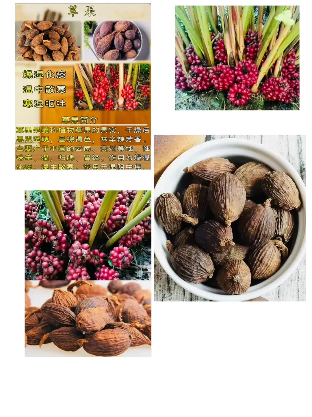 “草果纵沟棱线明,易纵撕裂气异清。燥湿温中除痰截,辟秽解瘟功不轻。”