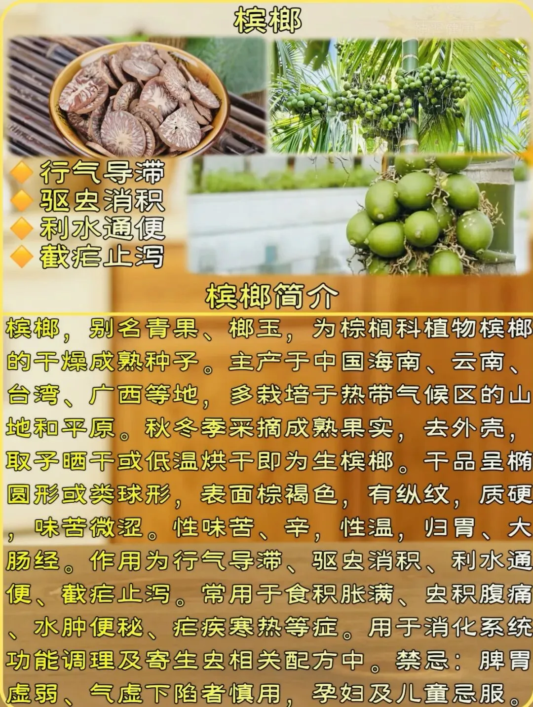 “槟榔种子纹如石,红白交错大理石。杀虫消积又行气,利水截疟效力奇。”