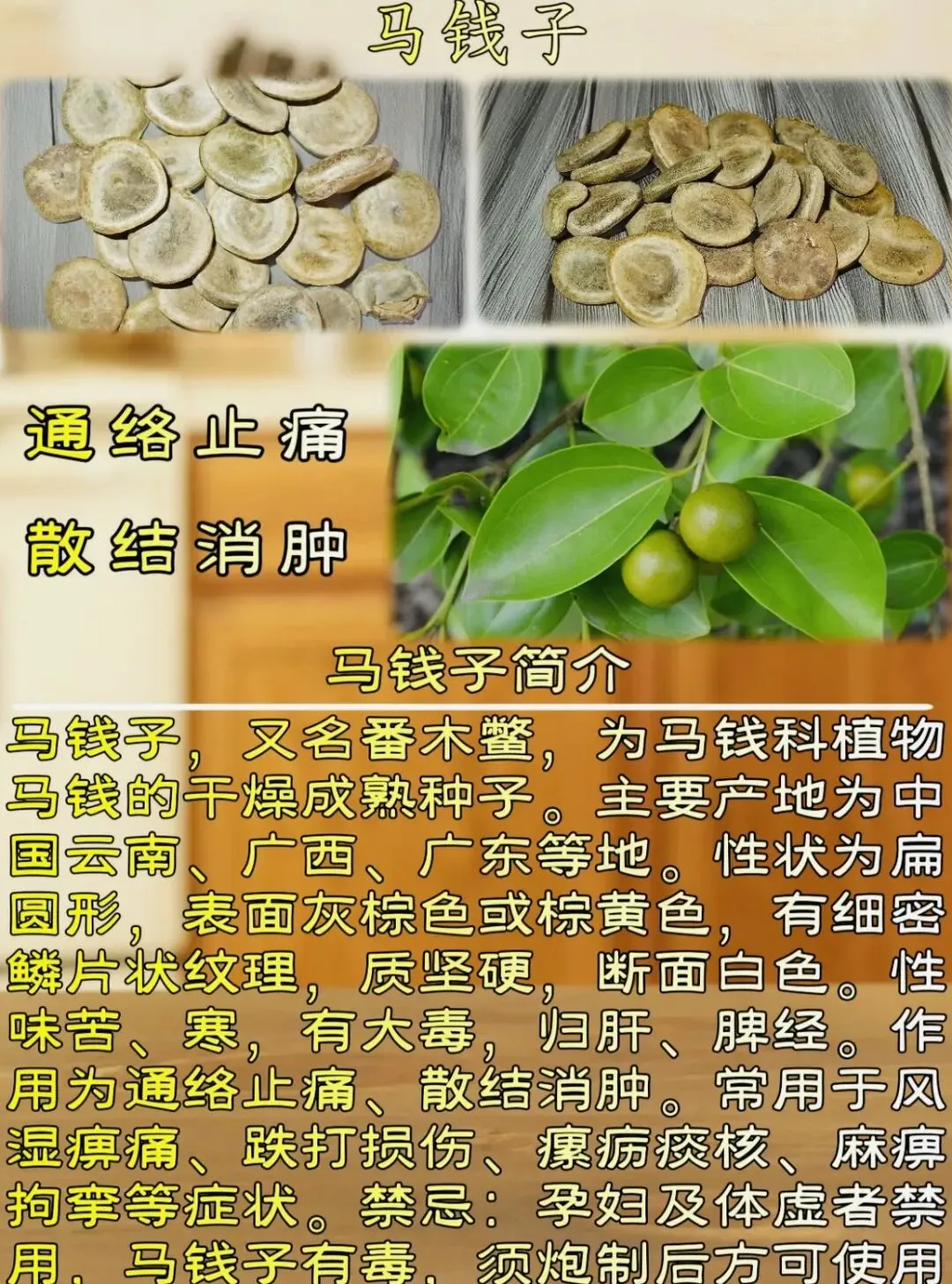 “马钱纽扣覆绢毛,光泽丝样味极苦。通络止痛散结肿,大毒慎用剂量小。”