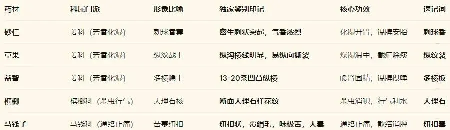 对比记忆:与砂仁比,草果沟纹深、易纵撕、气较浊,偏于燥湿截疟。