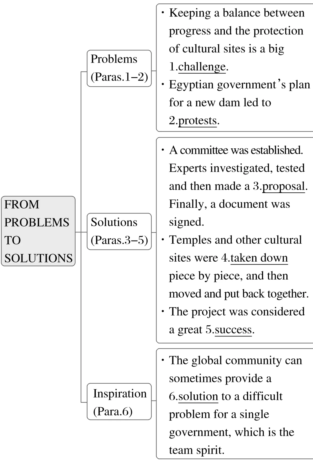 6.Temples and other cultural sites were taken(take) down piece by piece,and then moved and put back together again in a place where they were safe from the water.(P4 Para.4)