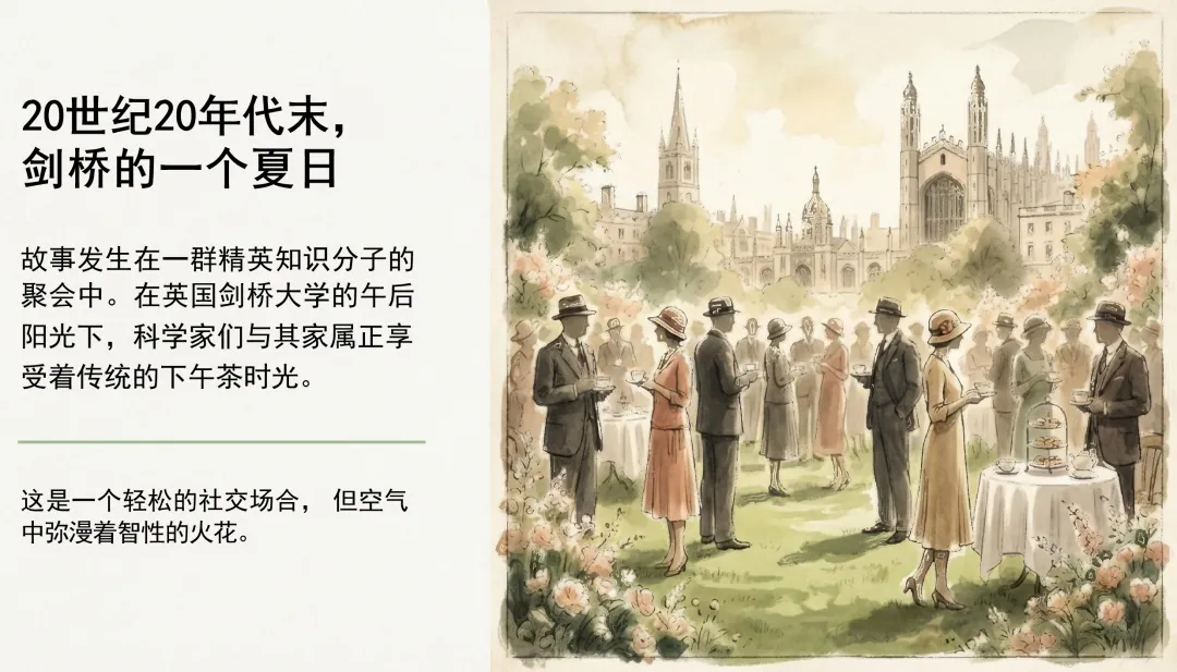 场景:20世纪20年代末的一个夏日午后,在英国剑桥大学,一群科学家和他们的家属在喝下午茶。