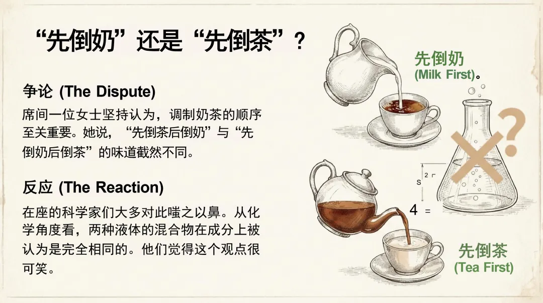争议:一位女士坚持认为,“先倒茶后倒奶”与“先倒奶后倒茶”的味道是不同的。在座的许多科学家觉得这个观点很可笑,认为两种液体的混合物在化学成分上不可能有区别。