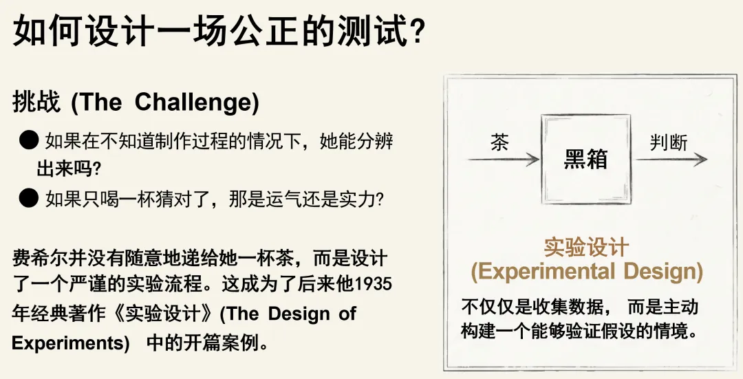 书中通过这个例子探讨了如何设计实验来验证一个假设(例如:她是否有能力分辨),以及如何处理随机性(例如:即使她猜对了几次,有多大概率是纯粹靠运气猜对的)。