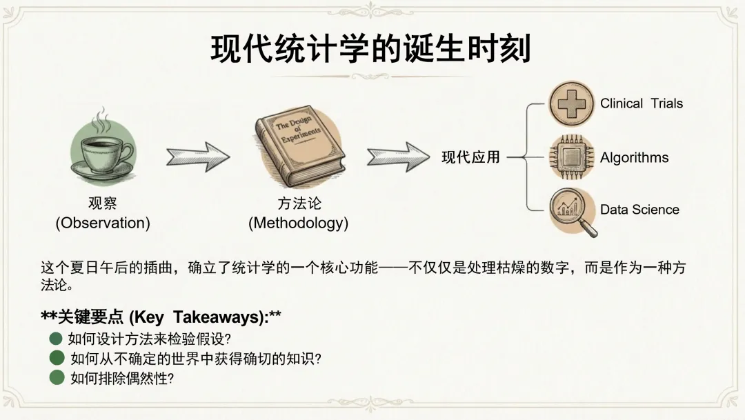 第一章通过“女士品茶”这个生动的故事,引出了现代统计学的核心概念——实验设计。它展示了统计学不仅仅是处理数字,更是关于如何设计方法来检验假设、排除偶然性,从而从不确定的世界中获得确切知识的学科。