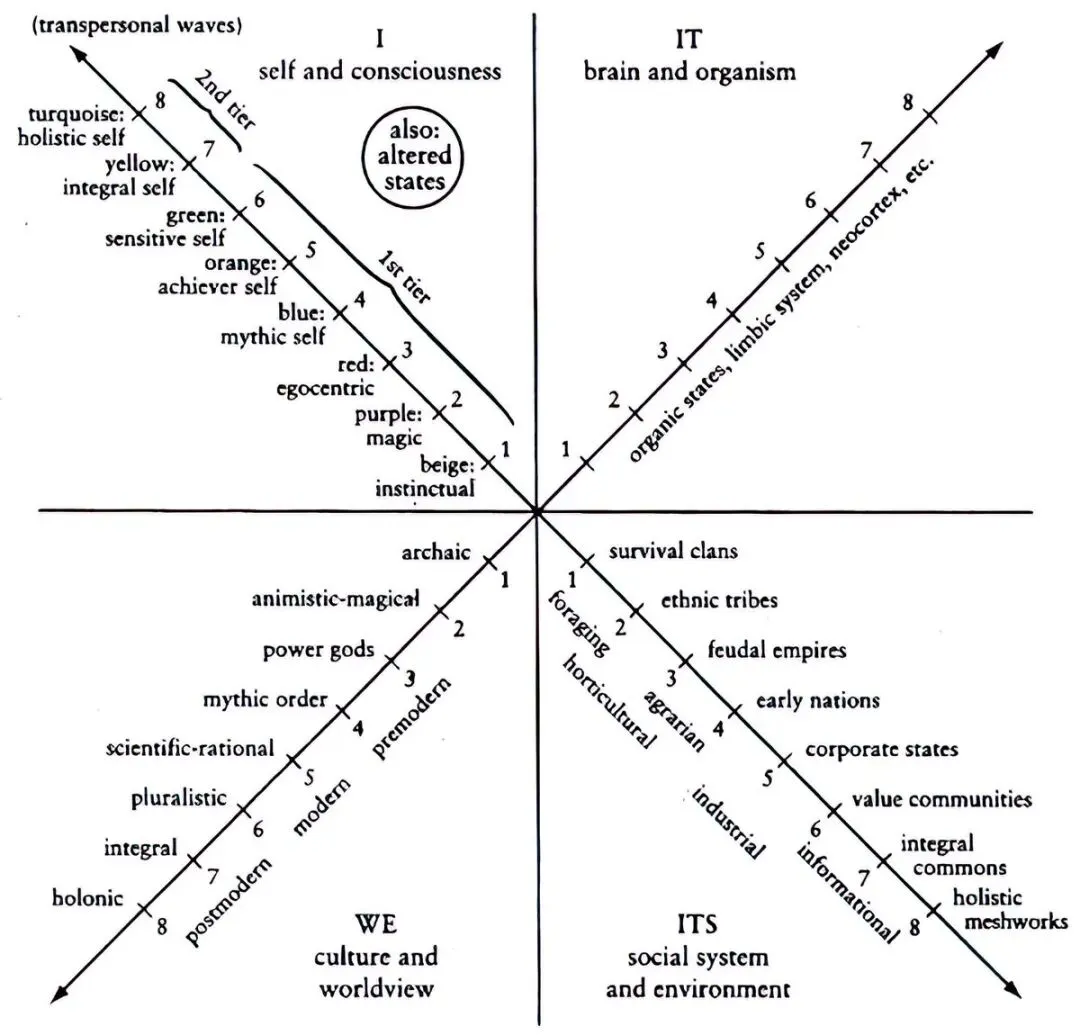 这些都导致了我们所做之事和工作方式的腐败。工作被拆解为简单的、重复的任务,让工人对整个过程一无所知,这样他们就无法自己复制它(这就是为什么通才总是击败专才)。换句话说,毫无意义的工作成了我们唯一的关注点和生存手段。 以至于我们无法看到其他方式,当 AI 真的从我们身上移除这个毒瘤时,许多人将面临残酷的觉醒。这导致了信息时代,计算机的发明导致了劳动的进一步抽象化。我们现在坐在办公桌前工作,而不是在田间劳作——在很大程度上——并让机器做繁重的工作。现在的主流世界观是后现代,我们开始解构之前的一切。后现代主义的关键洞察是“无视角主义”(aperspectivalism),即没有哪个视角是享有特权的。所有观点都是定位的、局部的和情境化的。这是一个伟大的成就,因为我们现在知道没有一个真实和绝对的观点(宗教上、政治上等)是每个人都必须遵守的。然而,这一成就进一步加速了意义危机。以至于我们开始意识到有些事情必须改变。它也导致了一个必须在我们正在进入的下一阶段(智能时代)解决的矛盾:如果没有哪个视角更好、更真实或更发达,那么“所有视角同样有效”这个主张本身,就是一个你声称更好的视角。这是一个价值排名。你通过建立自己的等级制度来解构所有的等级制度。后现代主义正确地看到了没有绝对的视角,但错误地得出结论说没有视角是更好的。来自“上面”的意义(神)→ 来自“外面”的意义(生产力和进步)→ 来自“无处”的意义(所谓的平等)→ 下一个是什么(来自“内在”的意义?)- 品味(Taste) 是未来的一项核心技能,它要求你说一样东西比另一样好。它要求排他性。