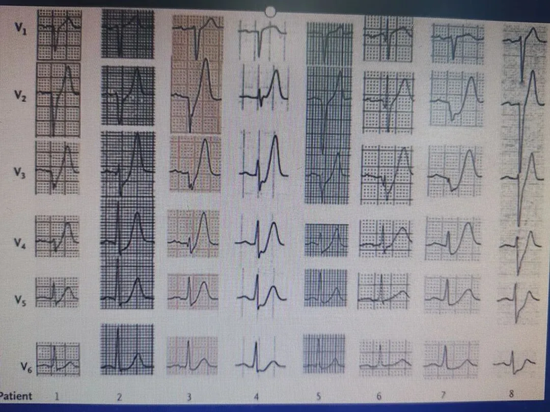 2008年De Winter等在新英格兰杂志发表了一个提示左前降支近端闭塞但无ST段抬高的心电图表现,主要特征为胸前导联V1-V6 ST段呈上斜形压低,J点压低,压低的ST段移行为对称高尖的T波,部分患者伴有胸前导联R波递增不良
