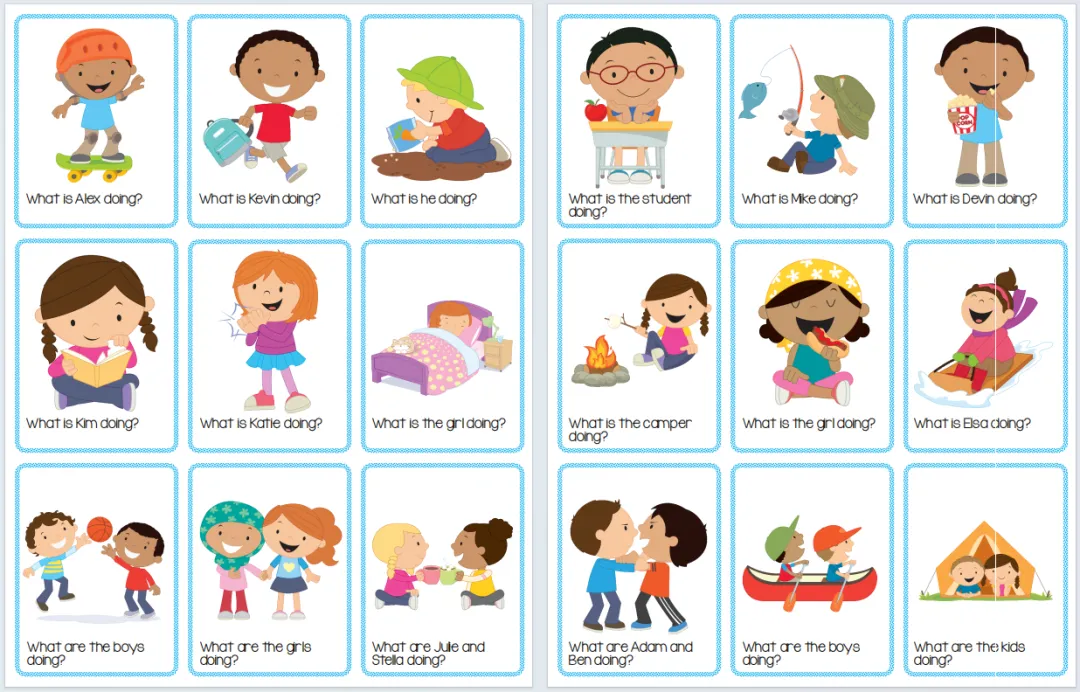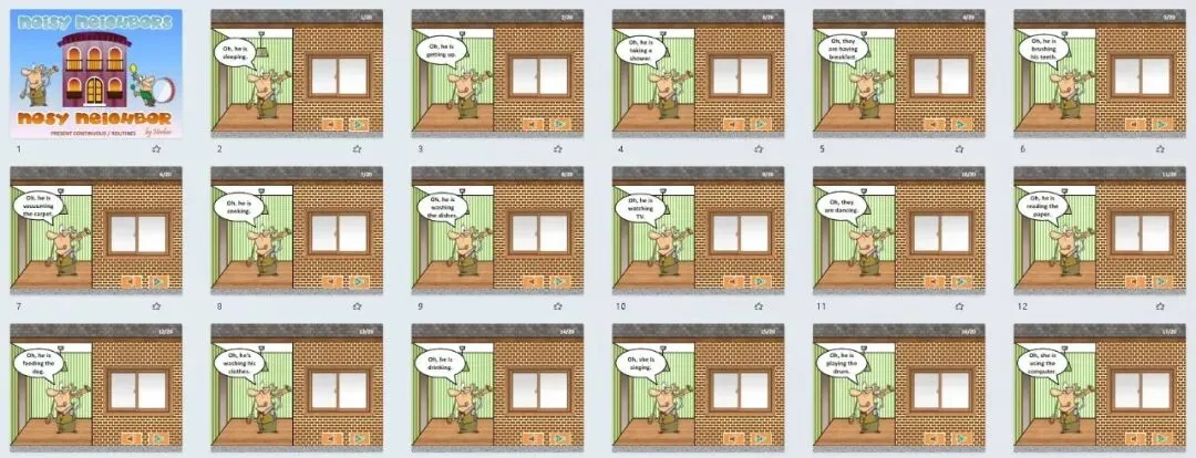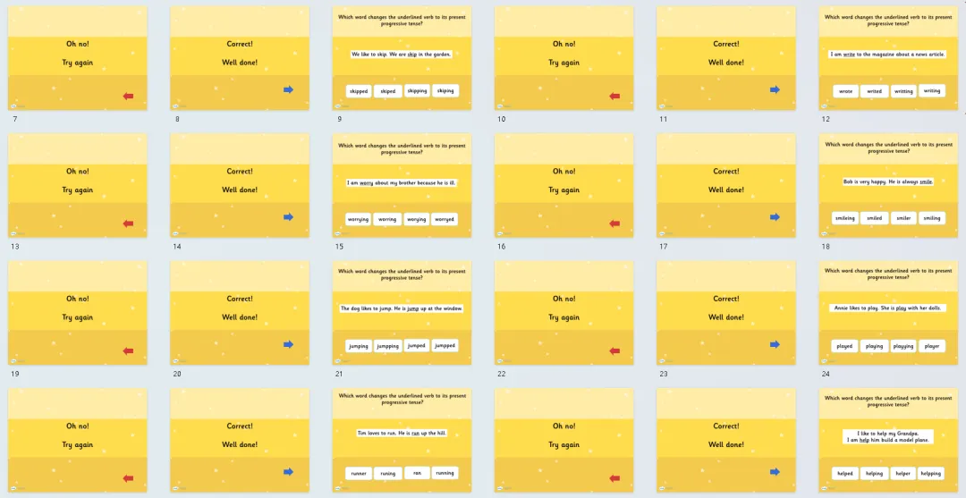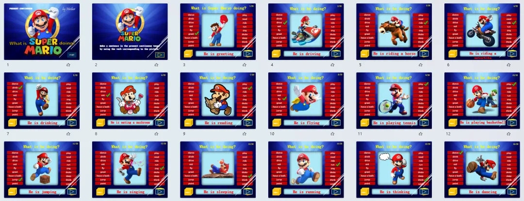 今天分享的是现在进行时学习素材,包含5套课件和10套练习,还有歌曲和教具卡片!