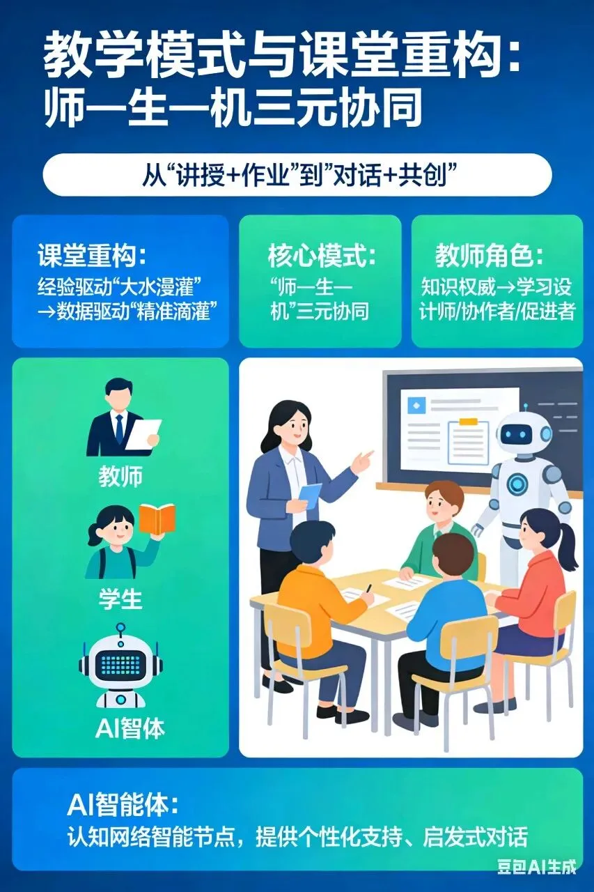 核心模式:“师—生—机”三元协同的课堂新模式(《中国智慧教育白皮书》)。