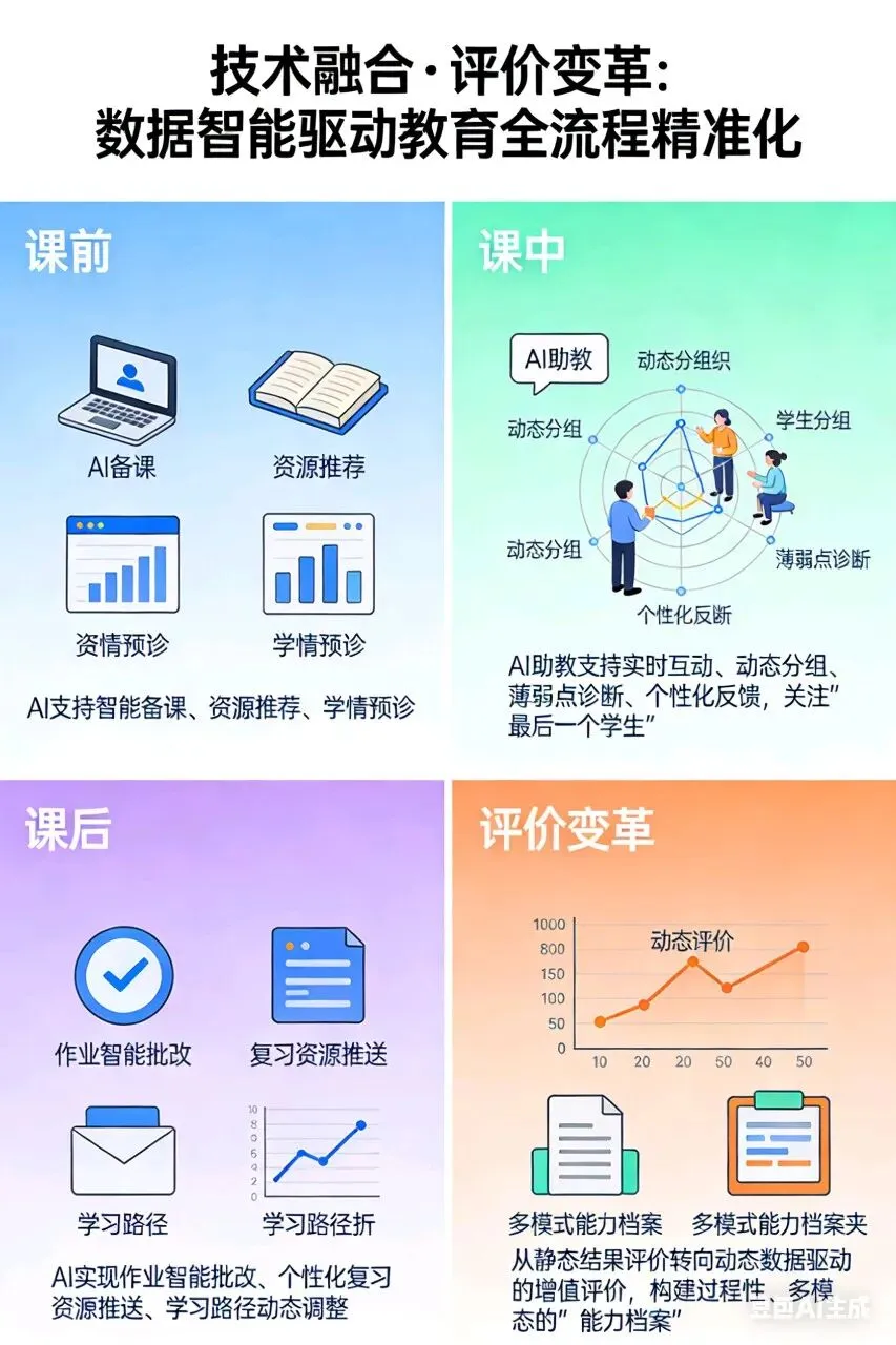 评价变革:从静态结果评价转向动态数据驱动的增值评价(《高等教育人工智能发展报告》),构建过程性、多模态的“能力档案”(《人机共育 向善而为》)。