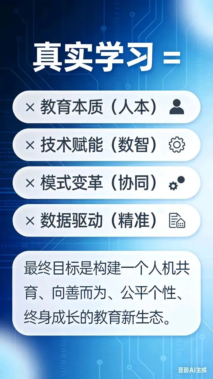 真实学习 = 教育本质(人本) × 技术赋能(数智) × 模式变革(协同) × 数据驱动(精准),最终目标是构建一个人机共育、向善而为、公平个性、终身成长的教育新生态。
