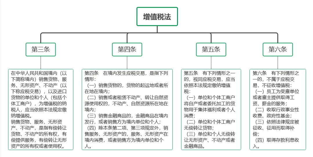 增值税法第三条是关于增值税的纳税人、征税范围、有偿的规定;第四条是明确“境内”应税交易的判定依据;第五条是规定视同应税交易的情形。第六条以正列举方式明确四种情形不征收增值税。