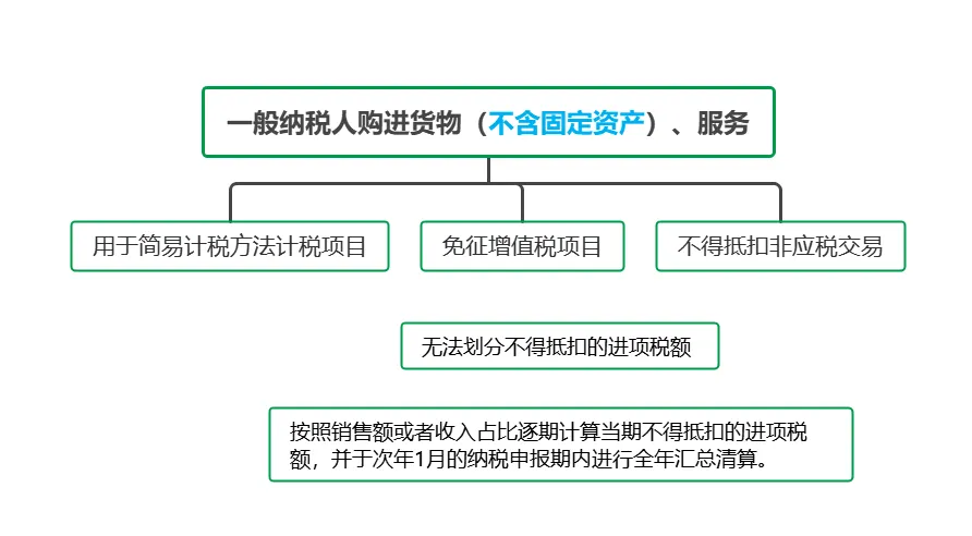 实施条例第二十三条:一般纳税人购进货物(不含固定资产)、服务,用于简易计税方法计税项目、免征增值税项目和不得抵扣非应税交易而无法划分不得抵扣的进项税额的,应当按照销售额或者收入占比逐期计算当期不得抵扣的进项税额,并于次年1月的纳税申报期内进行全年汇总清算。
