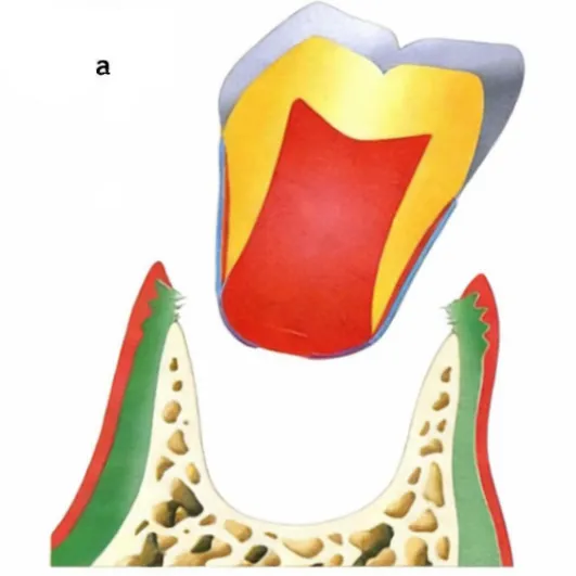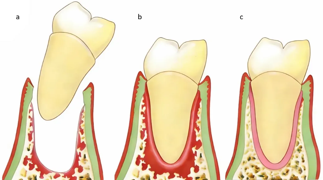 图2:牙齿植入预备后的牙槽窝后形成的再附着愈合(由牙体牙髓科研究生宛朵绘制)a. 移植前:仅在供体牙牙根上存在牙周膜,受牙区通过手术预备成适当的牙槽窝;b. 移植后:通过操作使牙龈结缔组织与供牙颈部牙周膜纤维紧密接触,在骨性窝壁与牙根之间形成血凝块;c. 愈合后:牙根与牙槽窝之间重新建立了牙周膜连接