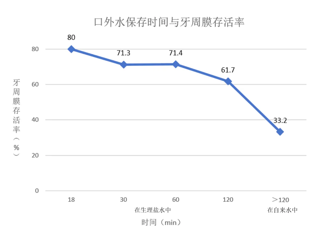 图4:供体牙口外水保存时间与牙周膜存活率之间的关系