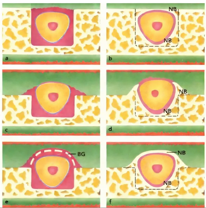 图7:供体牙牙周膜与水平骨再生之间的关系(由牙体牙髓科研究生宛朵绘制)a.将供体牙植入颊(舌)侧有骨缺损的受牙区 b.愈合后,尽管存在骨缺损,只要将供体牙完全植入骨内,牙周膜就能够诱导骨再生,供体牙就可以被新形成的骨(NB)所包围 c.将供体牙移植入受牙区,其颊侧或舌侧有部分位于骨性受牙区之外 d.愈合后,即使供体牙有牙周膜附着,骨缺损仍然存在 e.供体牙有部分位于骨性受牙区之外,但有引导骨再生材料(BG)覆盖 f.愈合后,即使移植时供体牙没有完全植入骨性受牙区内,但是植骨材料能诱导供体牙周围的骨再生(NB)