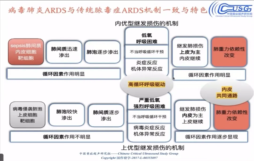哪怕是新冠病毒肺炎,看似是早期弥漫性上皮受损,但肺泡受损后出现渗出,会导致呼吸困难加重,进而出现高循环、高呼吸驱动,再加上病毒炎症也会损伤内皮,严重的自主呼吸又会同时损伤内皮和上皮,最终也会形成渗漏性的重力依赖实变,本质还是经历了继发损伤的过程。所以新冠肺炎的早期治疗,核心是镇静、控制自主呼吸驱动、早期体位治疗,否则极易发展为实变性的 ARDS。