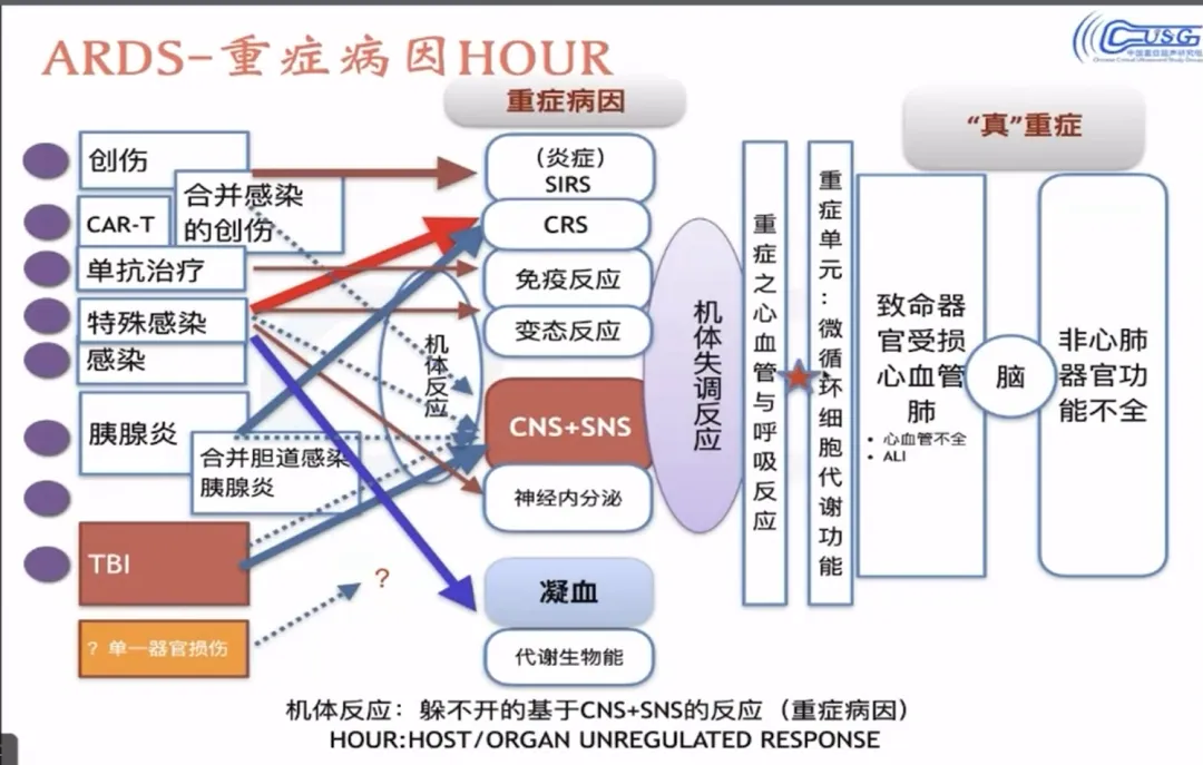 2. 基础损伤:机体出现失调反应(OUR),导致肺微循环内皮损伤,此为ARDS基本面;临床/影像可见超声弥漫小B线、CT毛玻璃肺,且无此征则不构成真正ARDS。