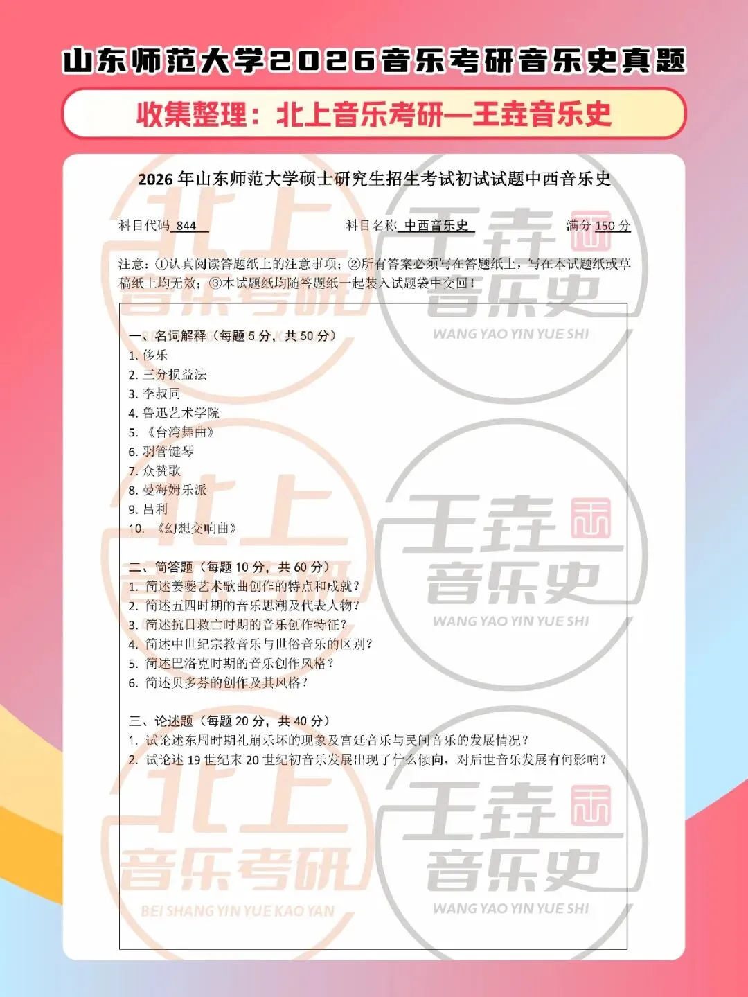 山东师范大学音乐史2026音乐考研音乐史真题|北上音乐考研-王垚音乐史工作室收集整理
