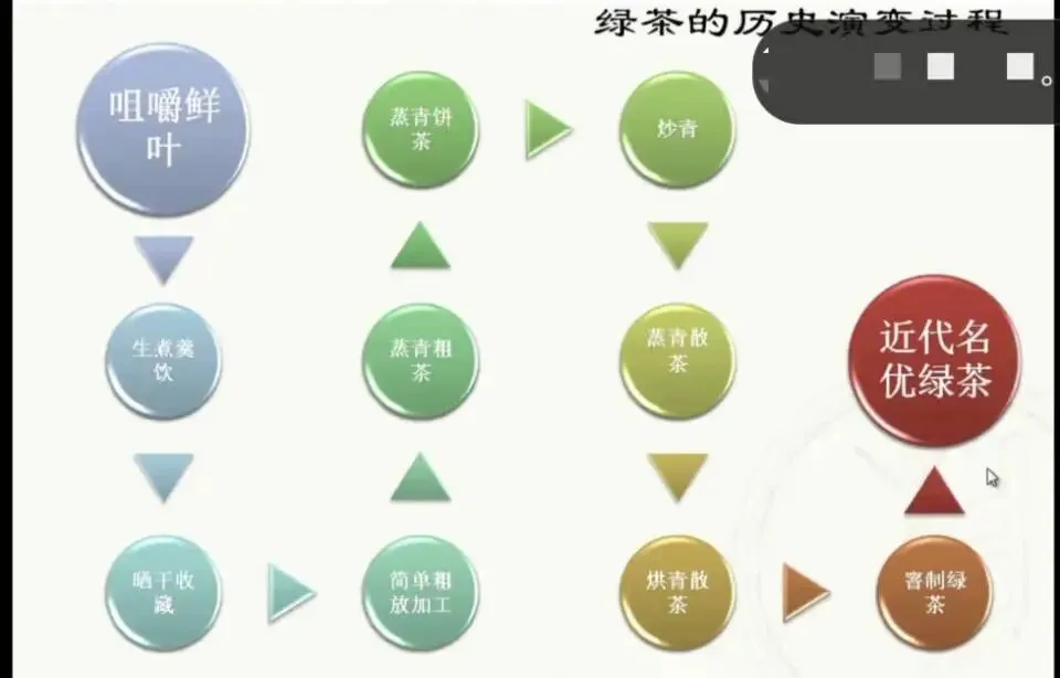 1. 起源:野生鲜叶→生煮羹饮→晒干收藏(春秋)→蒸青饼茶(三国)→炒青散茶(明)→现代多元工艺。