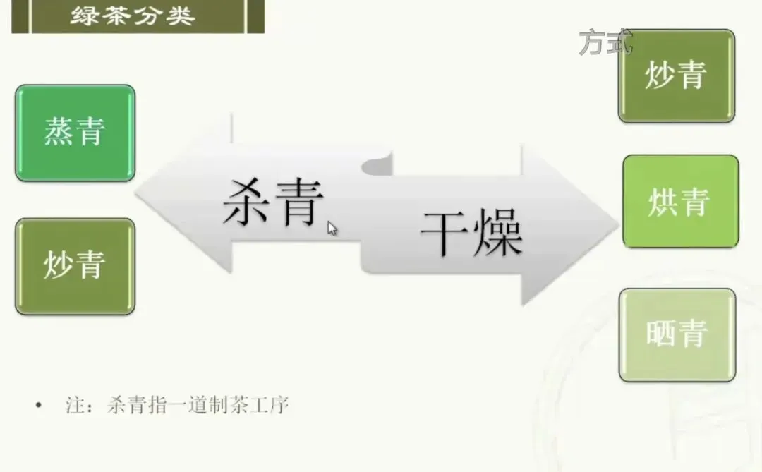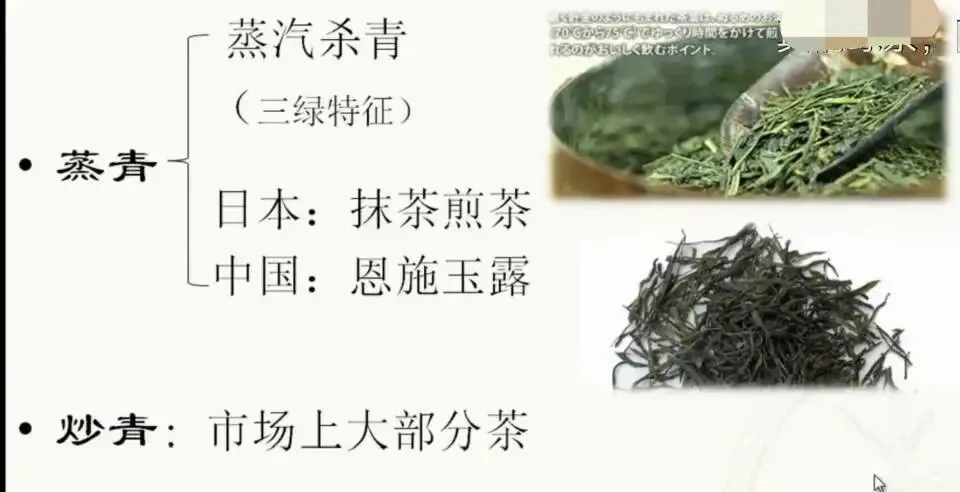 ① 蒸青:蒸汽杀青→“三绿”特征(干茶深绿、汤色浅绿、叶底青绿);代表:恩施玉露、日本抹茶、煎茶。