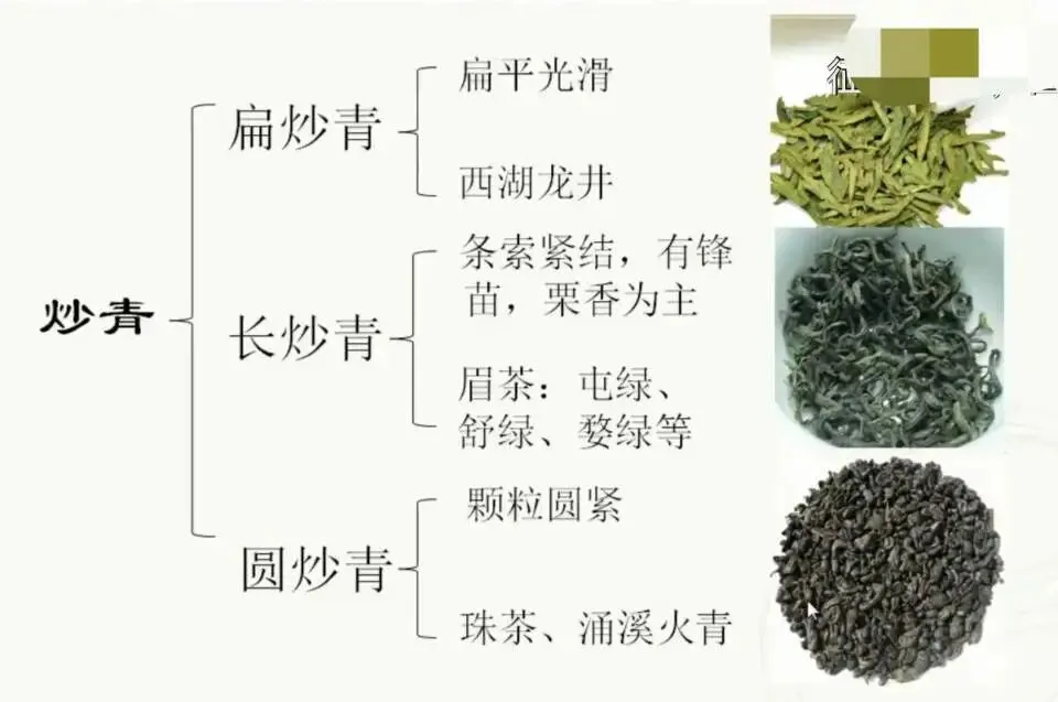① 炒干(炒青):滋味鲜爽醇和;分扁炒青(龙井)、长炒青(眉茶)、圆炒青(珠茶)。