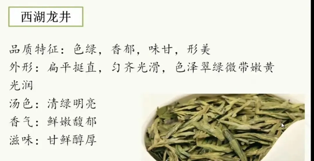 *1. 西湖龙井:色绿、香郁、味甘、形美;十大炒制手法成就“扁平光滑”。