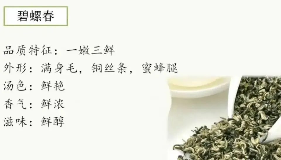 *2. 洞庭碧螺春:一嫩三鲜(芽嫩、色鲜、香鲜、味鲜);满身白毫,条索卷曲。