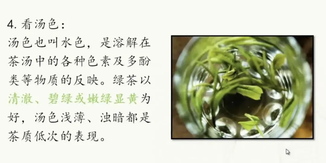 *4. 汤色:碧绿/嫩绿/绿黄且清澈;忌深暗、浑浊。