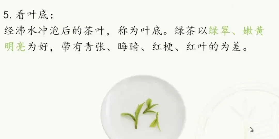 *5. 叶底:嫩绿明亮、芽叶完整;忌红梗红叶、青张晦暗。