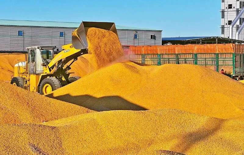 新征程上,要加强重点领域安全能力建设,夯实粮食、能源资源、产供链、战略通道等国家安全基础保障能力。图为2025年10月14日,在北大荒集团北安分公司龙镇农场有限公司粮食烘干合作点,铲车正在转运待烘干的玉米(无人机照片)。 新华社发 钱泊羽/摄