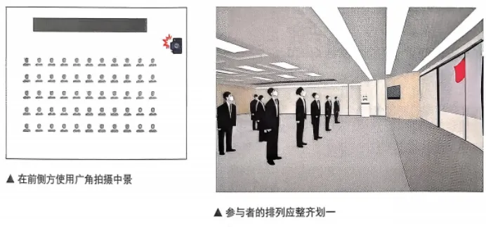 在拍摄包含注目礼环节的时候,拍摄者应特别注意前排人物行注目礼的主题环节。因此,可以考虑在前侧方使用广角拍摄中景。这样既能兼顾屏幕主题,同时也可以把第一排主要人物的正脸纳入镜头。为了保持画面的秩序美感,还要特别注意参与者的排列应整齐划一,地面可提前贴好地标。在拍摄多人时,如果参与者的队列站得不整齐,画面就会显得杂乱,缺乏会议应有的庄重、有序的整体效果。