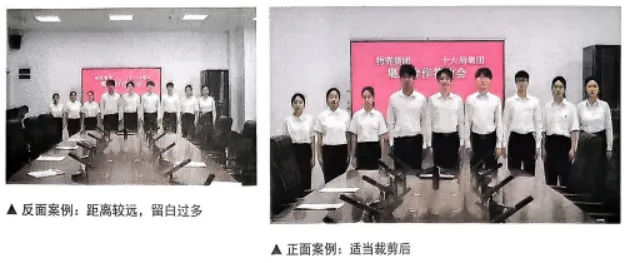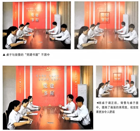 【对比举例】下页照片中,第1张照片涉及需要拍摄中心对称构图的会议场景,但是桌子和背景中的“党建书屋”没有同步居中,导致拍摄效果大大减弱。第2张照片的效果更好,背景墙上的字样在画面中位置对称、结构平衡,提高了画面的美观度和整齐度。